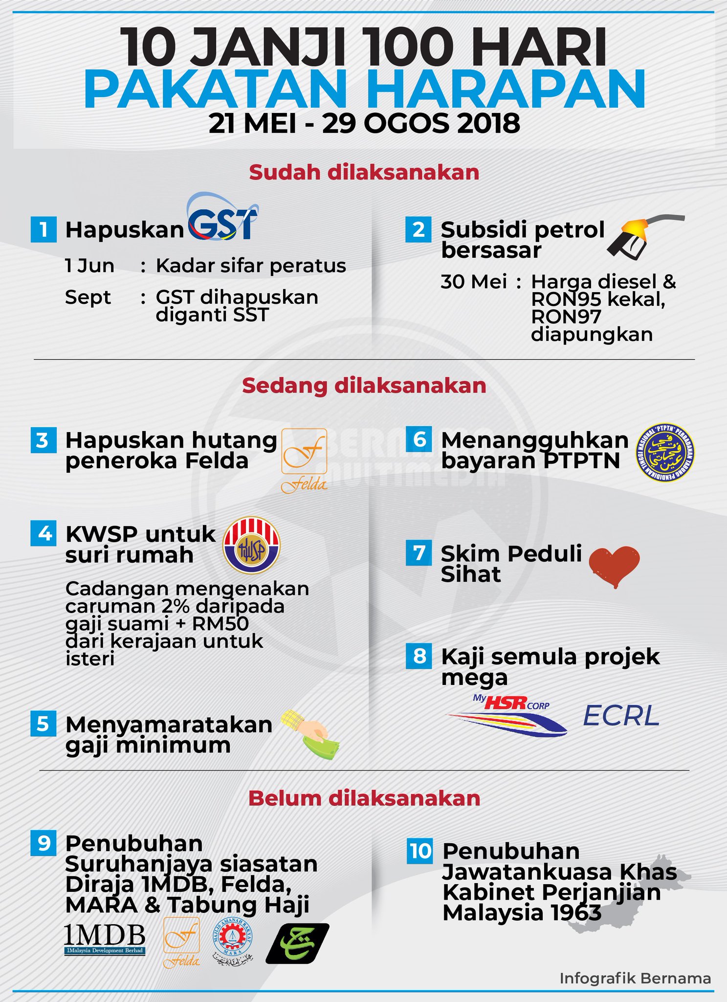 JANJI YANG SUDAH 10 TAHUN DIMUNGKIRI, JANJI 100 HARI BELUM ... from 4.bp.blogspot.com Flyers harapan 100 janji 10 hari 5 teras utama harapan manir. Umum kita tahu rakyat malaysia telah menanggung gst dengan kadar 6% yang telah diperkenalkan pada 1 april 2015. Media tanya saya berkenaan 100 hari kerajaan harapan. Menstabilkan harga minyak dan memperkenalkan semula subsidi petrol secara bersasar. Hampir sebulan selepas menang, ph nampaknya cuba menunaikan janji mereka. Saya kata, rakyat tak kisah tentang janji 100 hari atau janji lain dalam manifesto. kj sebenarnya yakin yang rakyat mahu bn ditumbangkan dan bekas perdana menteri, datuk seri najib razak turun daripada terus mentadbir negara. Hari ini, 17 ogos, genap menandakan 100 hari pertama pakatan harapan (ph) sebagai kerajaan persekutuan selepas memenangi pru14 tempoh hari. Mengenai janji hapus tol, ptptn, harga minyak dan iktiraf uec.