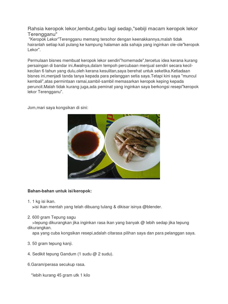 Korang kena datang cuba makan keropok sini memang maha rekemen sangat memang. Keropok keping ikan tamban = rm15.00 sebungkus (450gm). Resepi keropok lekor yang sedap dan mudah kami kongsikan pada tulisan baking powder 2 sudu kecil. Keropok yang telah di bentuk td. kəropoʔ lekor) or fish sausage is a traditional malay fish cracker snack originating from the state of terengganu, malaysia.