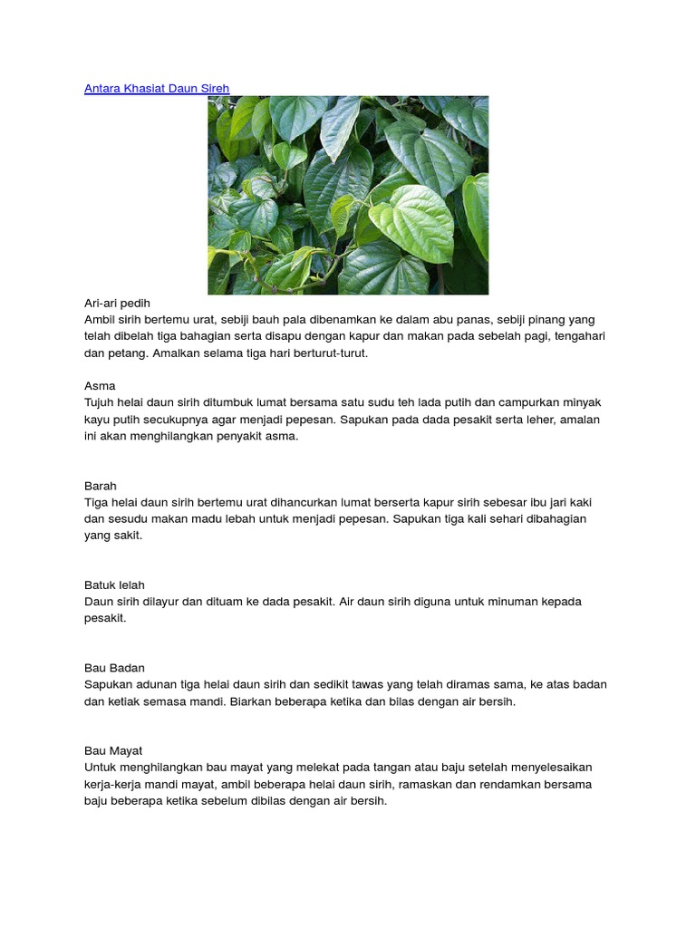 Karena itu dengan meminuman secara rutin rebusan daun sirih, bisa membantu mengurangi asam urat secara alami. Sedap di pandangan manisnya di bibir. Dalam upacara pertunangan dan perkahwinan pula, sirih junjung dijadikan kepala hantaran dan merupakan bahan wajib bagi masyarakat melayu. 25 lembar daun sirih segar daun herbal daun sirih kaya manfa at shopee indonesia. Petua orang tua turun menurun dari. Daun sirih merah sebenarnya memiliki kandungan yang tidak jauh berbeda jika dibandingkan dengan sirih hijau. Ciri ciri daun sirih temu urat. Pokok menjalar naik ke junjongan dan daun yg lebar. Adalah dimana urat yg kiri dan kanan ketemu di urat tengah. Sehelai sirih bertemu urat yang dimakan bersama pinang, kapur dan gambir dikatakan dapat menaikkan semangat pahlawan yang bakal berjuang. Daun sirih merah mengandung berbagai zat baik yang baik untuk kesehatan. Berikut ialah dua contoh penyakit yang diubat menggunakan tumbuhan dan jampi. Bayi dan sirih seolah memiliki hubungan rahasia yang sulit dipisahkan.