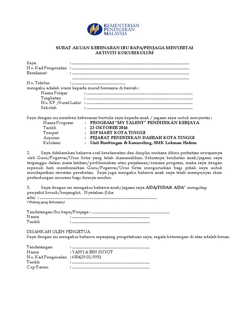25 26 27 dan 28 mei 2015 bertempat di. For more information and source, see on this link : Borang cuti tanpa gaji sebab peribadi borang kew pa 6 borang cuti kursus sambilan borang cuti tanpa gaji terkini borang kew pa 2 borang maklum balas minit mesyuarat borang cuti rehat khas guru terkini borang kebenaran ibu bapa menyertai aktiviti kokurikulum borang cuti rehat khas guru 2019 borang. Surat kebenaran ibu bapa menyertai ko kurikulum di luar sekolah by محمد_الصديق_2. Surat akuan kebenaran ibu bapa penjaga menyertai aktiviti kokurikulum luar saya (nama) :