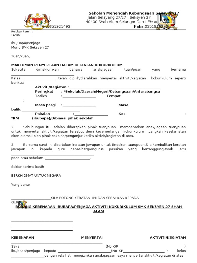 Beberapa contoh surat makluman aktiviti kokurikulum kepada ibu bapa terbaru 2019. Surat kebenaran ibu bapa kpm. Web viewborang perakuan kesihatan murid sebelum menyertai aktiviti kokurikulum anjuran jabatan pendidikan docx document. Borang kebenaran ibu bapa menyertai aktiviti kokurikulum kpm; Anak maut ibu bapa selfie; Borang bantuan baitulmal negeri sembilan; Borang pemarkahan pertandingan keceriaan kelas sempena sambutan kemerdekaan 2014. Surat akuan kebenaran ibu bapa penjaga menyertai aktiviti kokurikulum luar saya (nama) : Borang kew pa 7 terbaru 2019; Aktiviti perkhemahan rakan borneensis 2018, ums yang berlangsung mulai 19 hingga 21 mac 2018 Surat kebenaran ibu bapa standard jabatan pelajaran selangor. Bapa/ibu/penjaga kepada anak yang bernama : Borang ini difailkan dalam fail kebenaran menyertai aktiviti di bilik gpk kokurikulum.